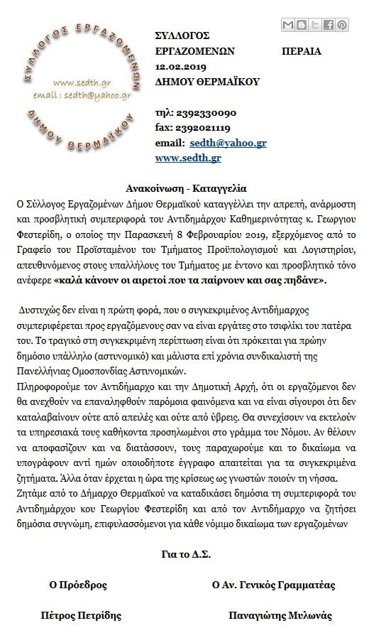 Ο Σύλλογος Εργαζομένων Δήμου Θερμαϊκού καταγγέλλει την απρεπή, ανάρμοστη και προσβλητική συμπεριφορά του Αντιδημάρχου Καθημερινότητας κ. Γεωργιου Φεστερίδη, ο οποίος την Παρασκευή 8 Φεβρουαρίου 2019, εξερχόμενος από το Γραφείο του Προϊσταμένου του Τμήματος Προϋπολογισμού και Λογιστηρίου, απευθυνόμενος στους υπαλλήλους του Τμήματος με έντονο και προσβλητικό τόνο ανέφερε «καλά κάνουν οι αιρετοί που τα παίρνουν και σας πηδάνε».
