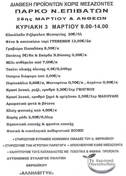 Σύμφωνα με ανακοίνωση του Αυτόνομου Συλλογου Πολιτών “Η Αλληλεγύη” η οποία έχει αναρτηθεί δημοσίως σε πολλά σημεία του Δήμου Θερμαϊκού την Κυριακή στις 3 Μαρτίου από τις 09:00 μέχρι τις 14:00 θα πραγματοποιηθεί νέα διάθεση προϊόντων “ΧΩΡΙΣ ΜΕΣΑΖΟΝΤΕΣ” στο Πάρκο των Νέων Επιβατών επί της οδού 25ης Μαρτίου και Ανθέων.