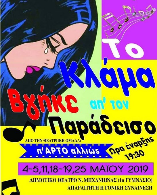 Μια ξεκαρδιστική κωμωδία υπόσχεται ότι θα παρουσιάσει σε έξη παραστάσεις μέσα στον Μάιο αρχίζοντας από σήμερα Σάββατο, η θεατρική ομάδα ”π’ΑΡΤΟ ΑΛΛΙΩΣ” σε όσους επιλέξουν να την παρακολουθήσουν στο Δημοτικό Θέατρο της Νέας Μηχανιώνας (στο 1o Γυμνάσιο).