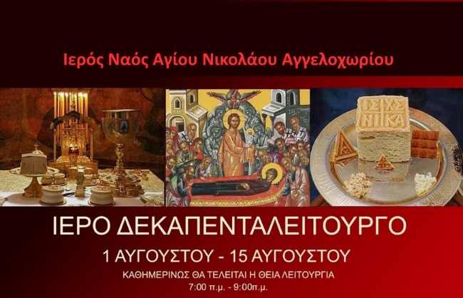 Εν όψει του Πάσχα του Καλοκαιριού -εορτής της Κοιμήσεως της Θεοτόκου θα τελεστεί στον Ιερό Ναό Αγίου Νικολάου Αγγελοχωρίου στον Δήμο Θερμαϊκού το Ιερό Δεκαπενταλείτουργο από 1η έως 15 Αυγούστου καθημερινά από τις 7:00 μέχρι της 9:00 το πρωί Θεία Λειτουργία και παράκληση.
